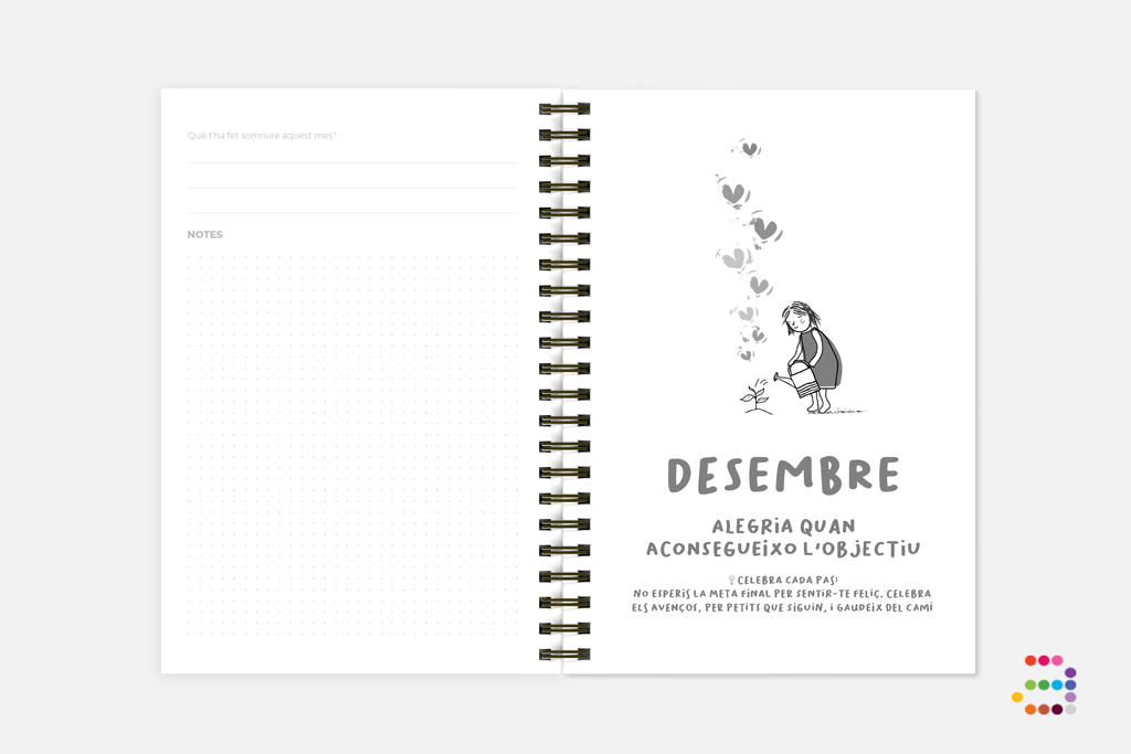 Trobaràs també un calendari de l'any en curs + l'any següent, un planificador mensual a primers de cada mes, així com dies festius o celebracions que has de tenir en compte.