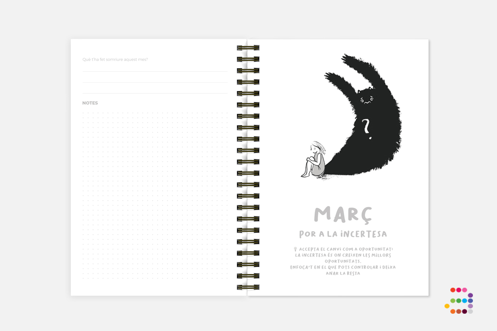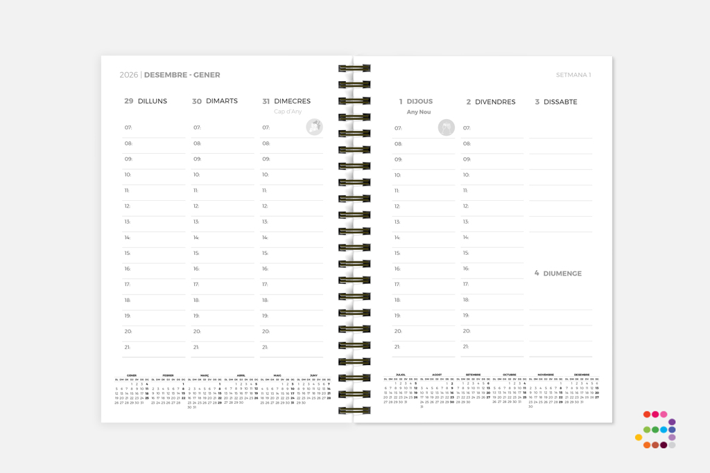 Trobaràs també un calendari de l'any en curs + l'any següent, un planificador mensual a primers de cada mes, així com dies festius o celebracions que has de tenir en compte.