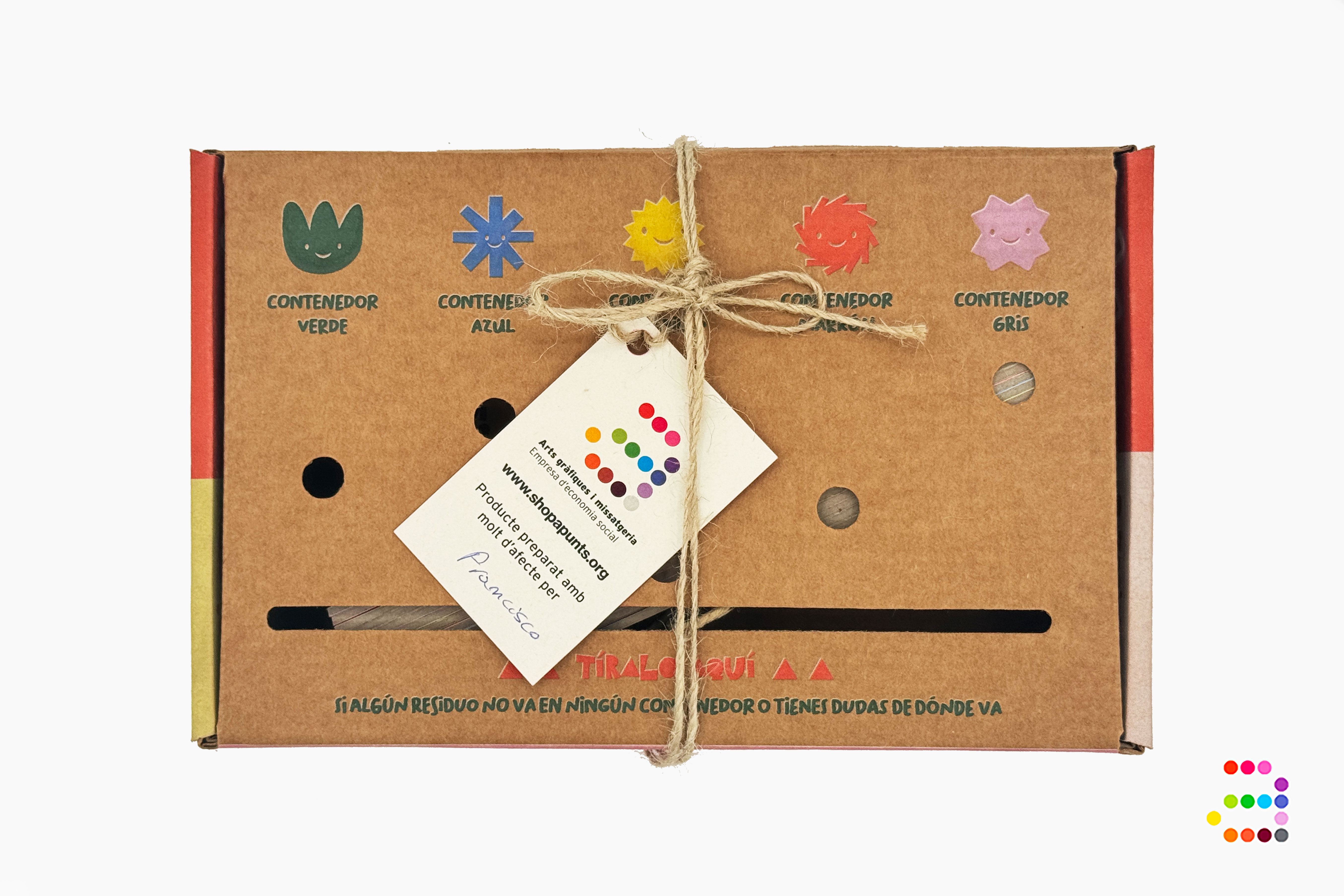 Aquest joc es produeix artesanalment al nostre centre especial de treball, on generem ocupació per a persones amb trastorn de salut mental. És una proposta educativa que combina valors socials i ambientals.