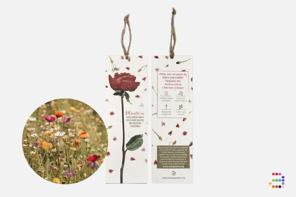 Prenent com a símbol principal la rosa, aquest punt de llibre està fet de paper de llavors plantable. Les llavors són variades, i contribueixen a la pol·linització.