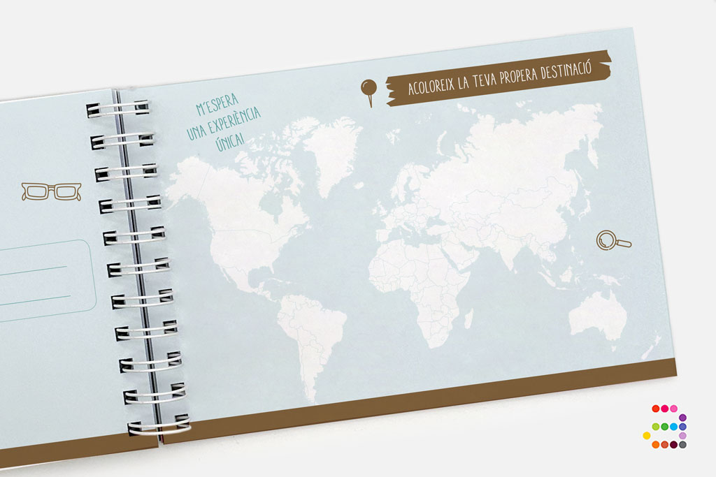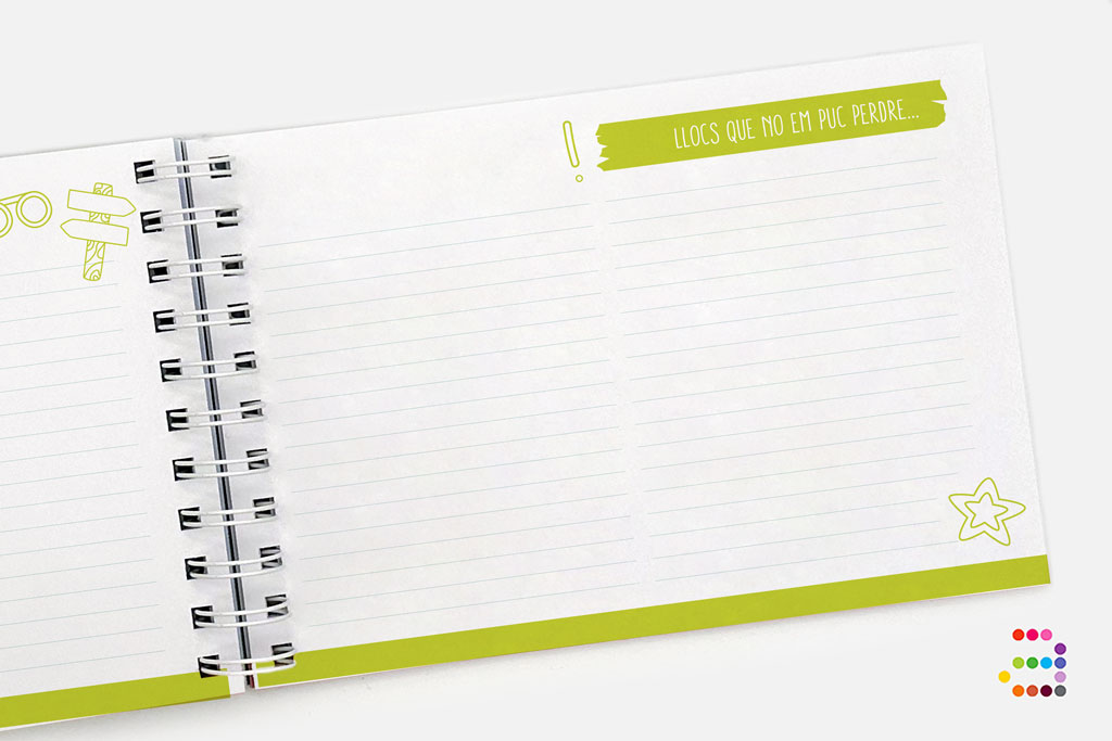 Diari de viatge. Tindràs dues pàgines per dia per a escriure i enganxar fotografies, entrades, bitllets, tickets... El que tu vulguis! Al final de tot trobaràs un espai per a ecriure el més curiós, el que has après, les teves impressions...
