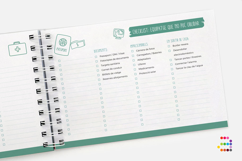 Planificació, on escriuràs el teu destí, els llocs que no et pots perdre, la planificació diària del que t'agardaria fer, un espai per anotar les paraules clau en un idioma estranger i un checklist per a totes les coses que has de posar a la maleta.
