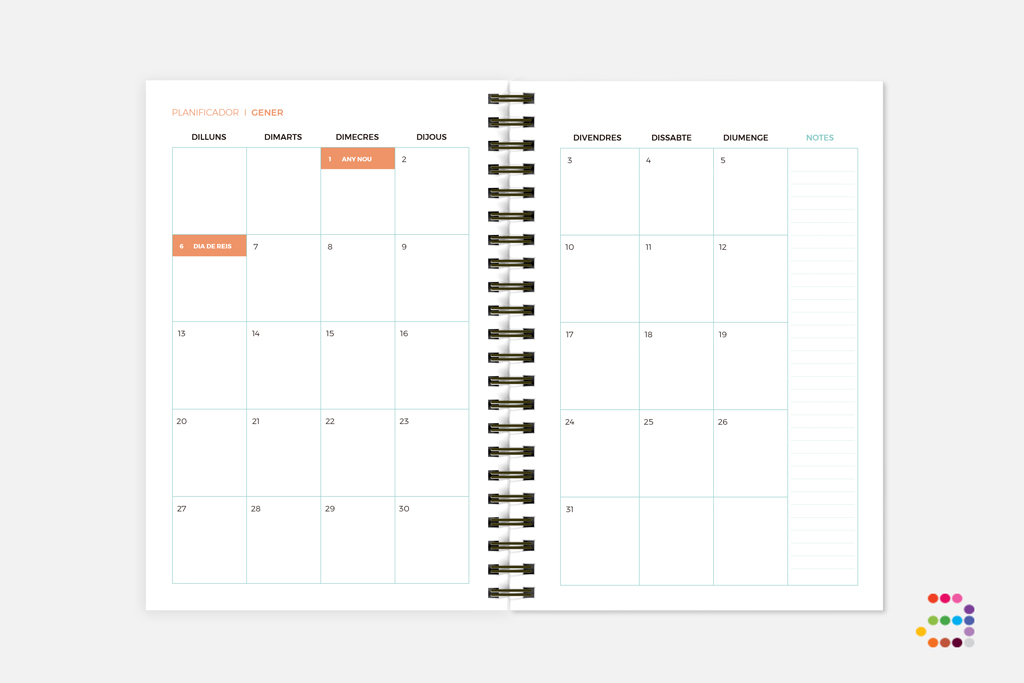 Trobaràs també un calendari de l'any en curs + l'any següent, un planificador mensual a primers de cada mes, així com dies festius o celebracions que has de tenir en compte. A més les tapes d'aquesta agenda són de butxaca per poder guardar papers o documentació.