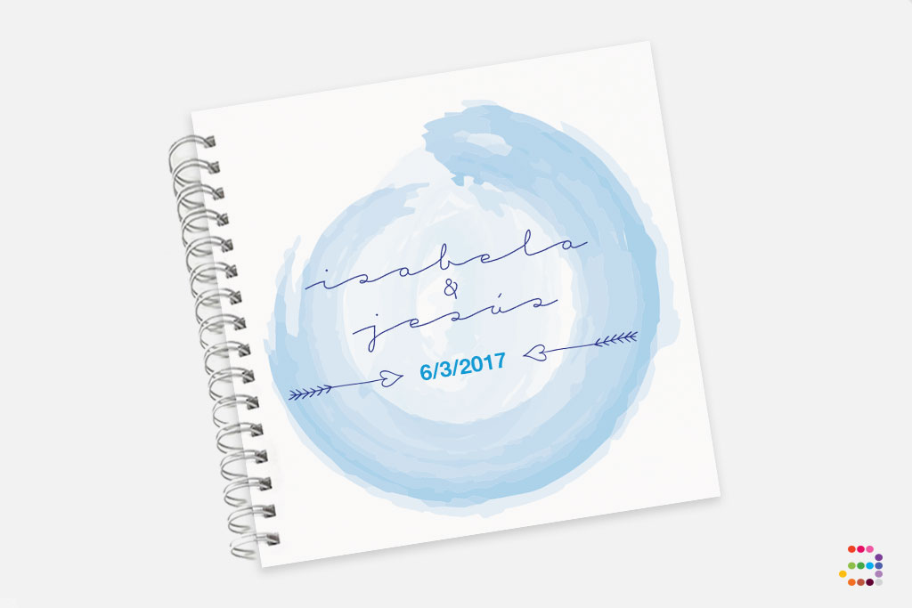 La portada i contraportada d'aquest llibre de firmes per boda estan inspirades en l'aquarel·la, incorporant un detall molt senzill en color blau o lila. L'interior és de paper blanc d'alt gramatge i totes les pàgines contenen un detall gràfic per fer l'interior ben elegant.