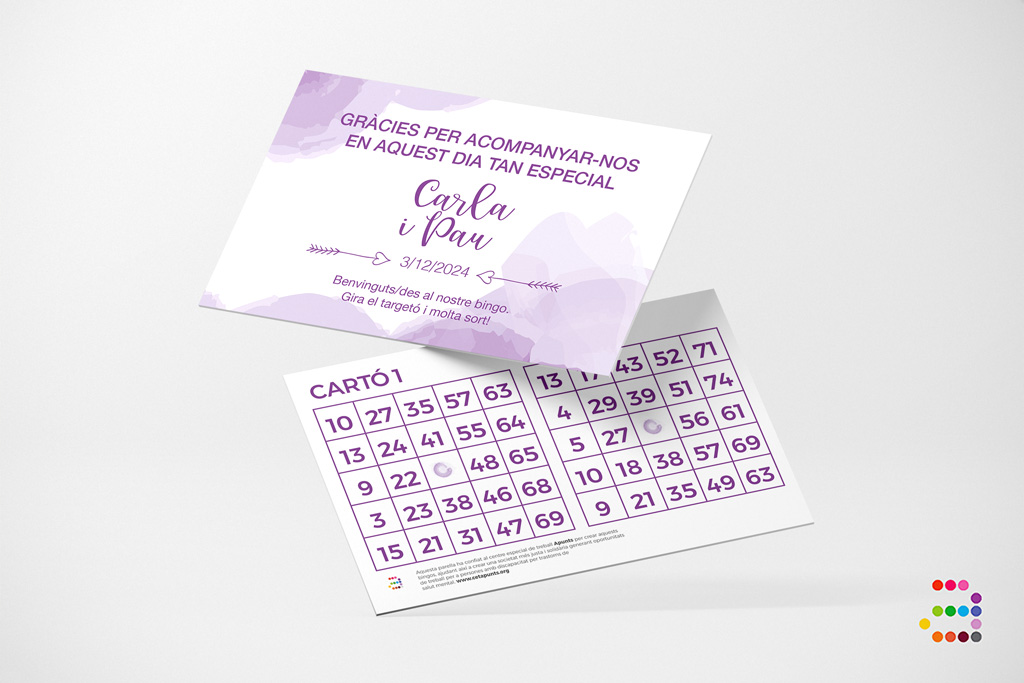 Per una cara el cartró va personalitzat amb els noms de la parella i la data del casament. Per l'altra cara es personalitza la frase inferior on s'indica en quin moment es farà la partida de Bingo.