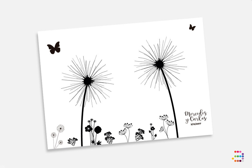 La làmina va impresa sobre paper blanc de 300g i la personalitzem amb el vostre nom i la data del casament. Té una mida estàndard de 42x29,7cm (DIN-A3).