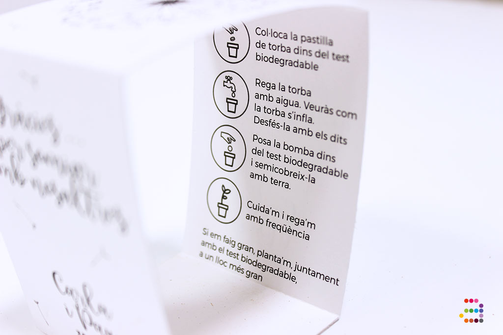 És un test personalitzat a la faixa amb el nom de la parella i la data del casament. A l'interior de la faixa es troben les instruccions per a plantar el test.