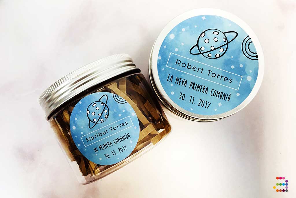 Aquestes enganxines amb planetes es personalitzen amb el nom i la data de l'esdeveniment.