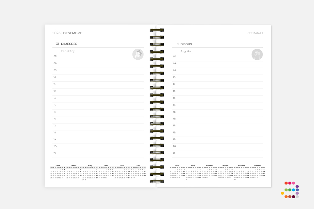 Trobaràs també un calendari de l'any en curs + l'any següent, un planificador mensual a primers de cada mes, així com dies festius o celebracions que has de tenir en compte.