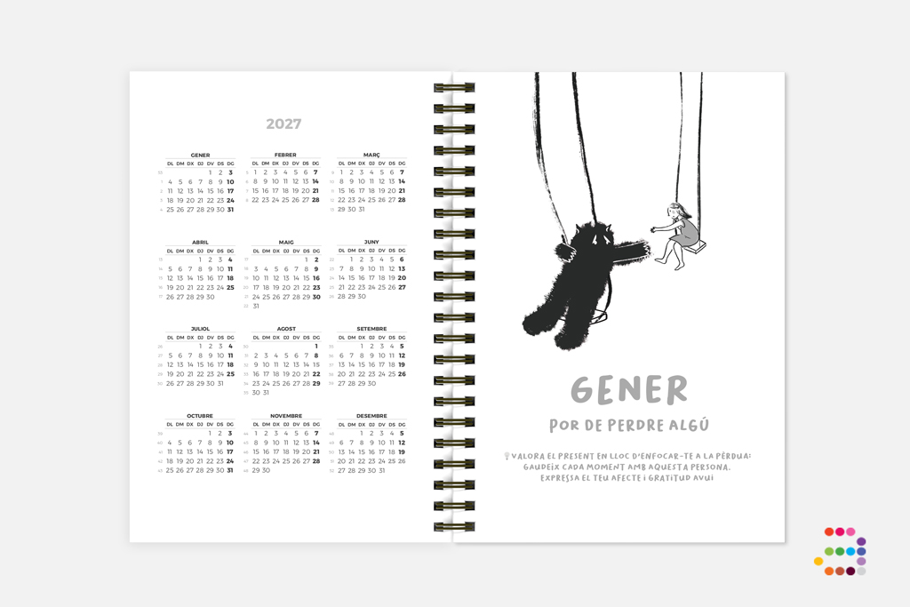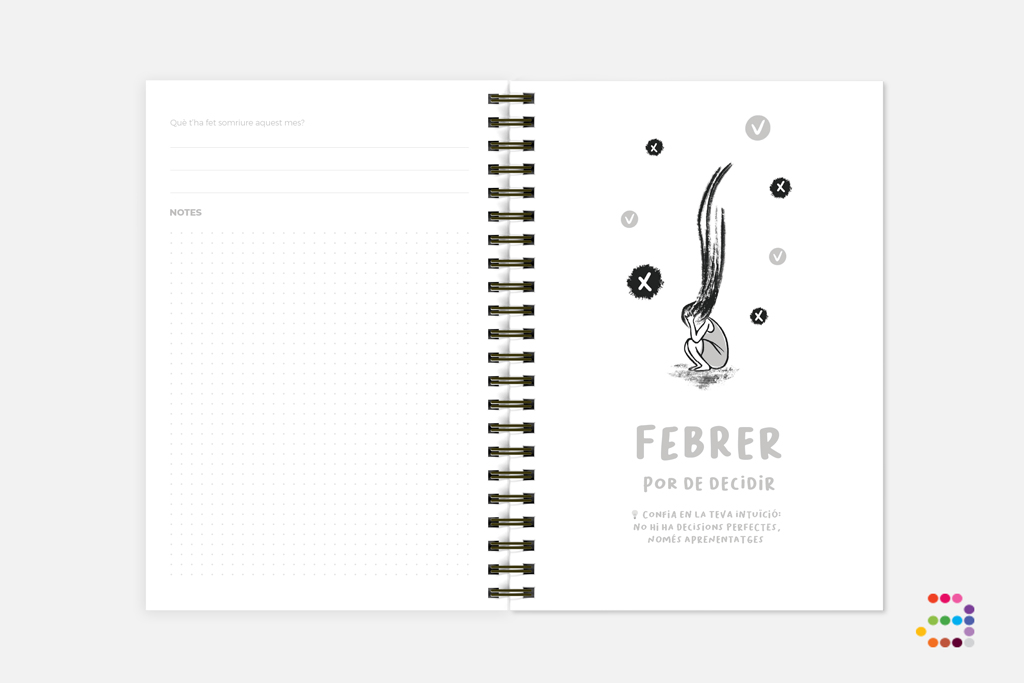 Trobaràs també un calendari de l'any en curs + l'any següent, un planificador mensual a primers de cada mes, així com dies festius o celebracions que has de tenir en compte.