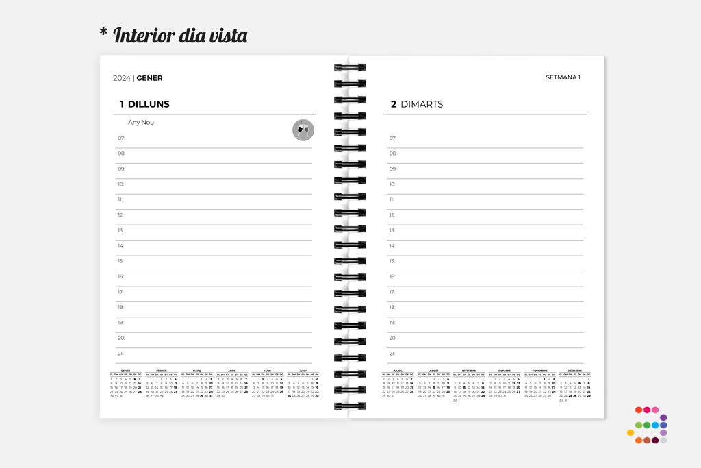 Si t'agrada tenir els dies planificats al detall, i a més necessites tenir sempre la informació a mà, l'agenda dia vista serà la teva millor aliada, on tens un munt d'espai per a anotar les teves tasques, totes les teves reunions, cites, reserves o esdeveniments.