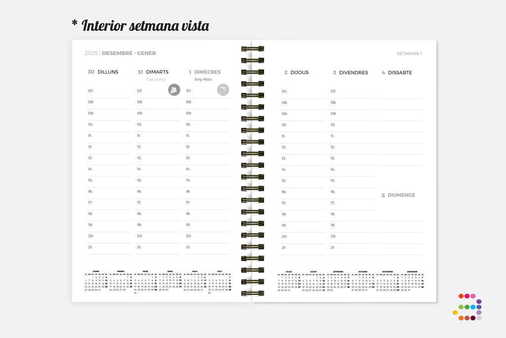 Trobaràs també un calendari de l'any en curs + l'any següent, un planificador mensual a primers de cada mes, així com dies festius o celebracions que has de tenir en compte. A més les tapes d'aquesta agenda són de butxaca per poder guardar papers o documentació.