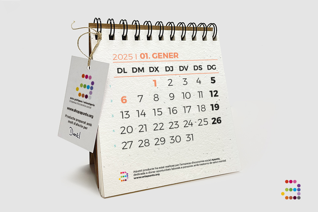 El calendari té una mida de 14x15cm i és ideal per tenir sobre la taula, a la oficina o a casa.