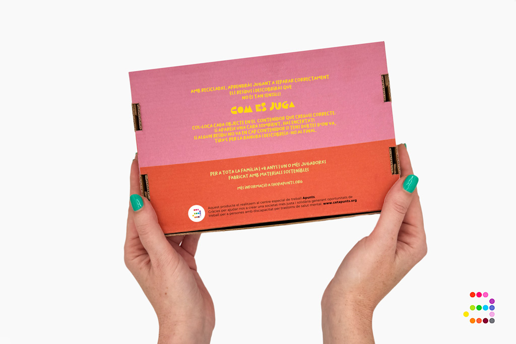 Aquest joc es produeix artesanalment al nostre centre especial de treball, on generem ocupació per a persones amb trastorn de salut mental. És una proposta educativa que combina valors socials i ambientals.