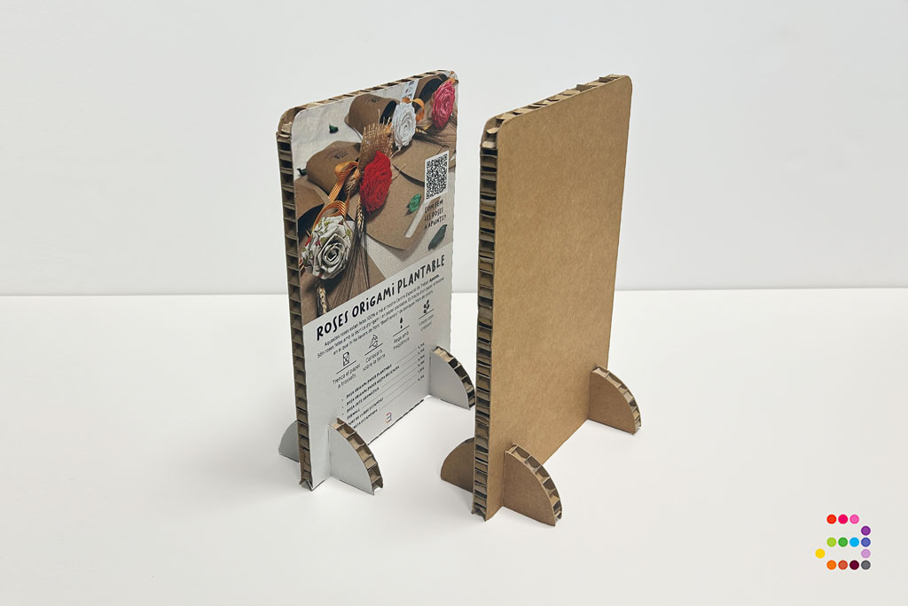 El cartró niu d'abella imprès és un suport rígid 100% reciclable i molt lleuger. Destaca per la seva duresa ideal per a expositors i estands.