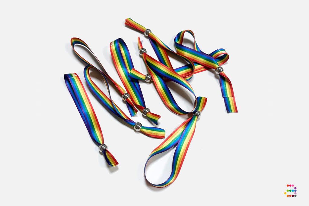 Oferim aquesta polsera amb els colors de la bandera LGBTIQ+, que pots entregar en actes, festivitats, o on tu vulguis.