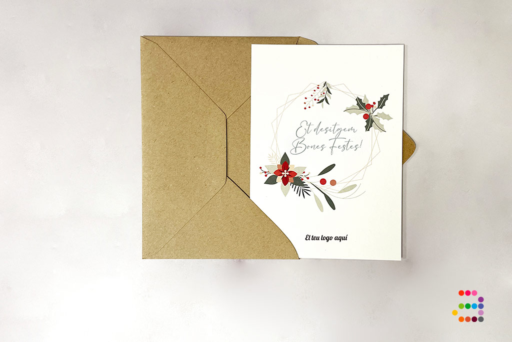 Inclou la postal de 148x210mm i un sobre en color kraft, tancat amb etiqueta adhesiva amb el logotip de la teva empresa o organització.