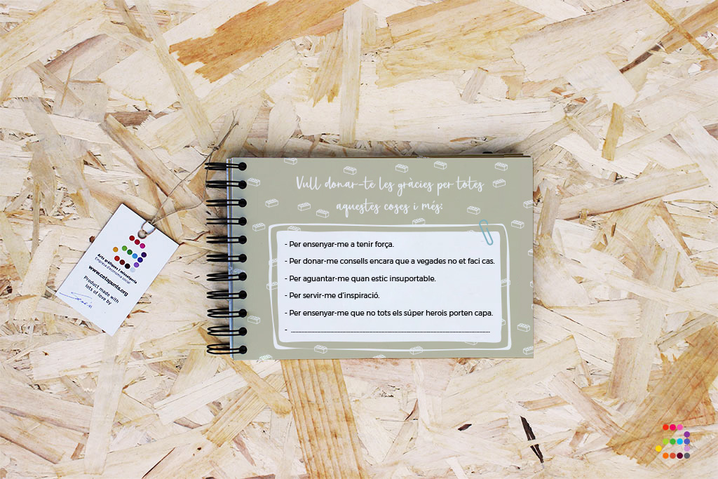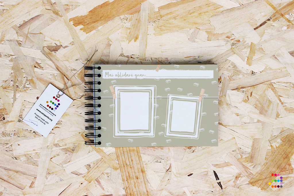 Té una mida de 210x140mm, amb 30 fulles en paper reciclat gruixut (300 grams), va enquadernat amb espiral i porta una goma perquè quedi ben tancat.