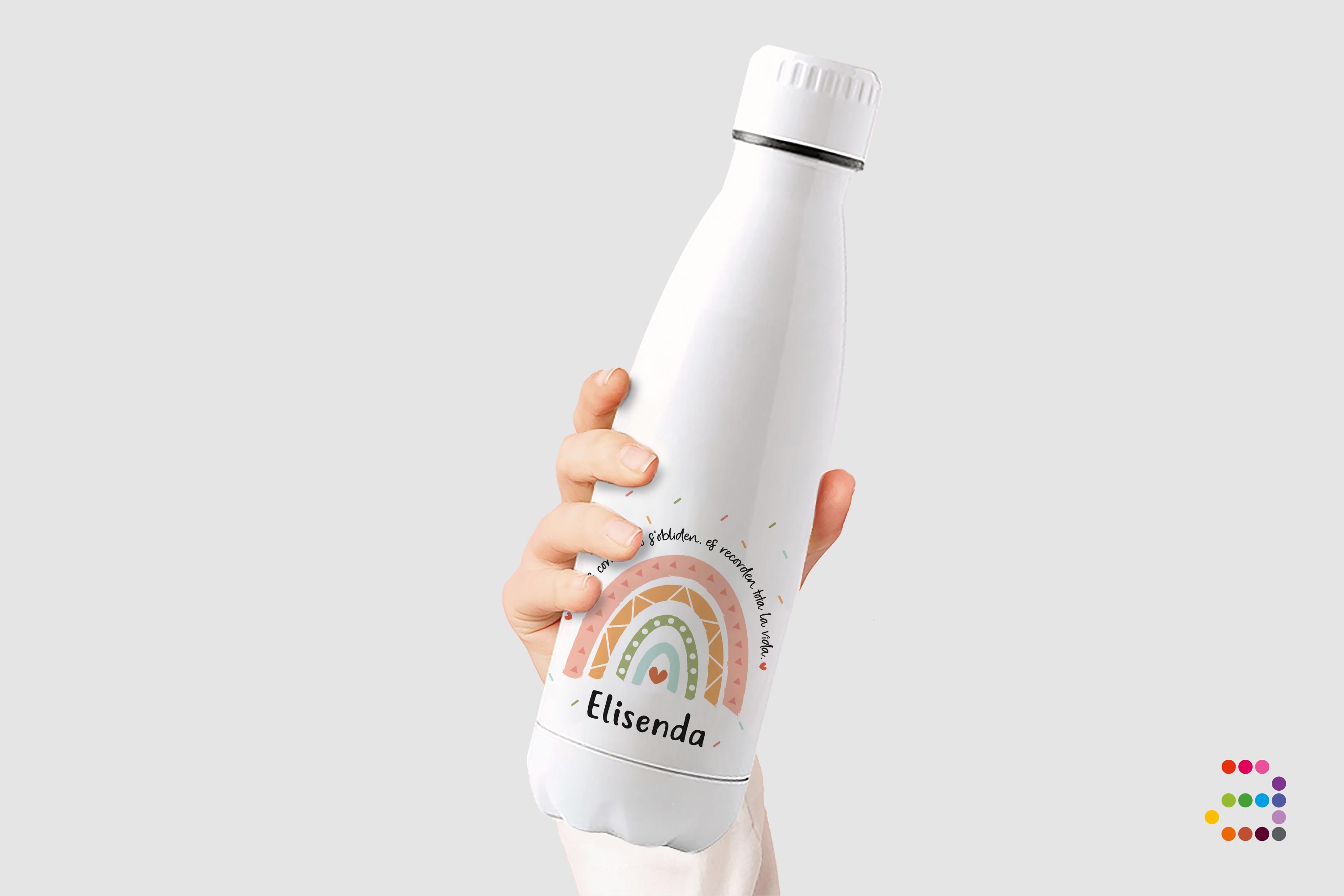 - Una ampolla reutilitzable d’acer inoxidable amb el nom del/la profe. Perfecta per al dia a dia i per reduir l’ús de plàstics d’un sol ús.