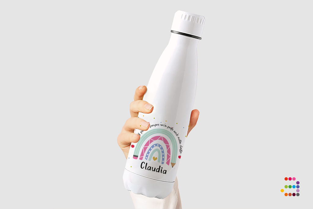 - Ampolla d’acer inoxidable amb el seu nom. Perfecta per al dia a dia i per reduir l’ús de plàstics.