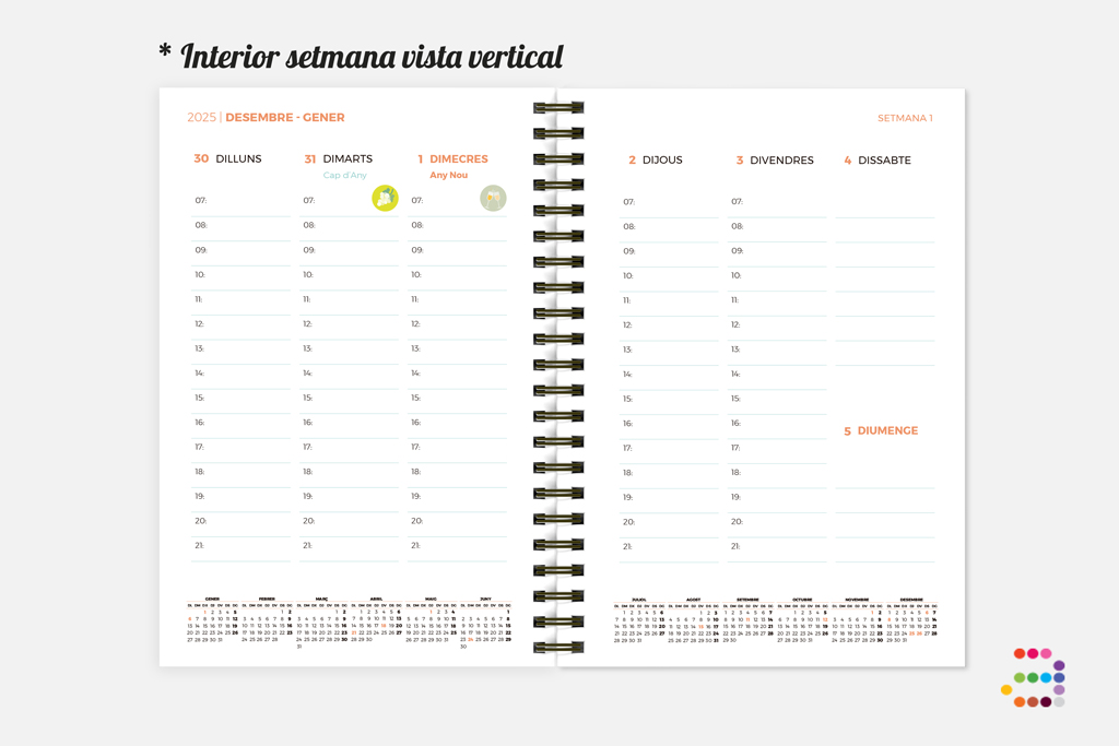 Trobaràs també un calendari de l'any en curs + l'any següent, un planificador mensual a primers de cada mes, així com dies festius o celebracions que has de tenir en compte. A més les tapes d'aquesta agenda són de butxaca per poder guardar papers o documentació.