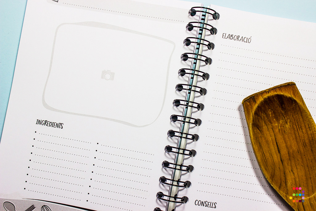 El llibre de receptes té una mida d'A5 (148x210mmm). Escull el color, l'idioma i la portada personalitzada i ¡bon appétit!