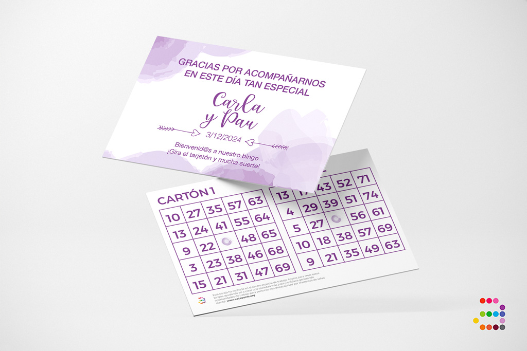 Por una cara el cartón va personalizado con los nombres de la pareja y la fecha de la boda. Por la otra cara se personaliza la frase inferior donde se indica en qué momento se hará la partida de Bingo.