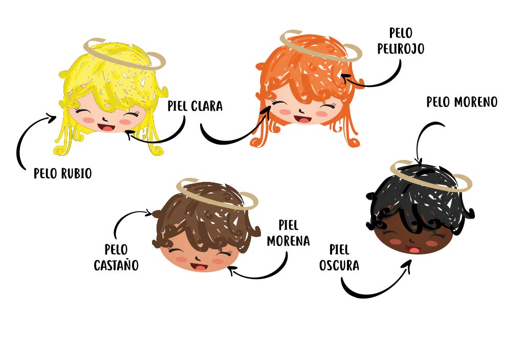 Esta colección está pensada para que todos los niños y niñas que quieran hacer la primera comunión se sientan identificados/as. Es por eso que los angelitos de la colección son personalizables, así el niño o niña podrá elegir el color de piel y de pelo del angelito.