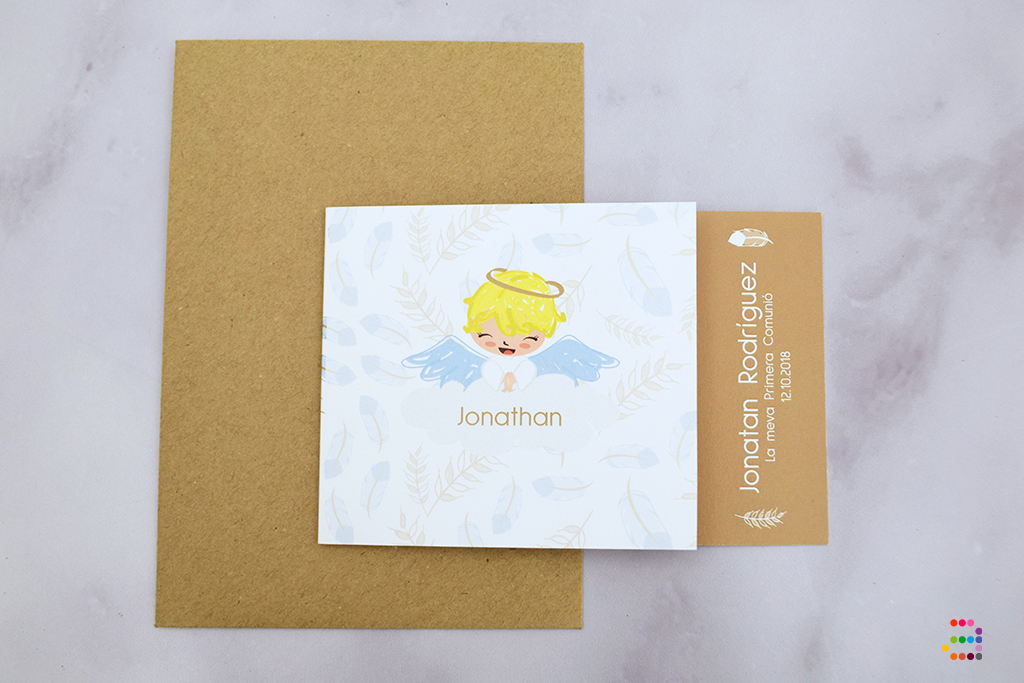 ¡Combina tus invitaciones de comunión con el resto de productos de la colección Ángel y conjunta tu papelería de comunión!