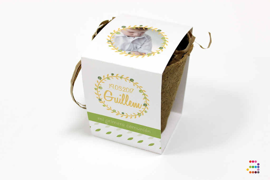 Estas macetas para comunión contienen todo lo necesario para plantar una planta: maceta biodegradable, bomba de semillas variadas y turba (tierra desecada). La faja se personaliza con el nombre, la fecha y una fotografía. En el interior de la faja se encuentran las instrucciones para plantar la maceta.