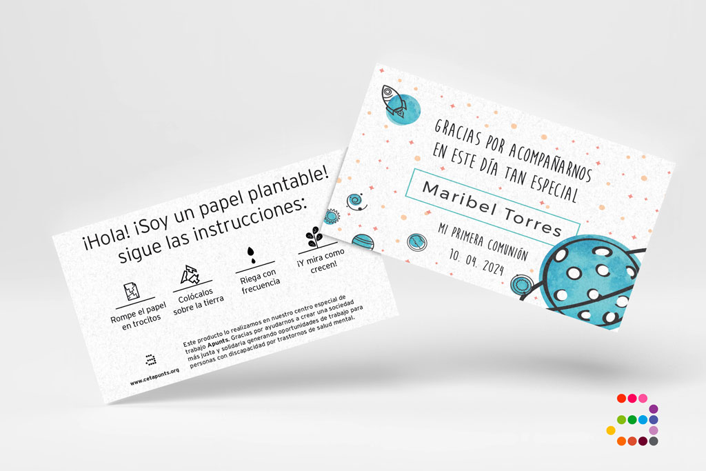Tarjeta de agradecimiento para comunión Planeta ¡en papel plantable!
