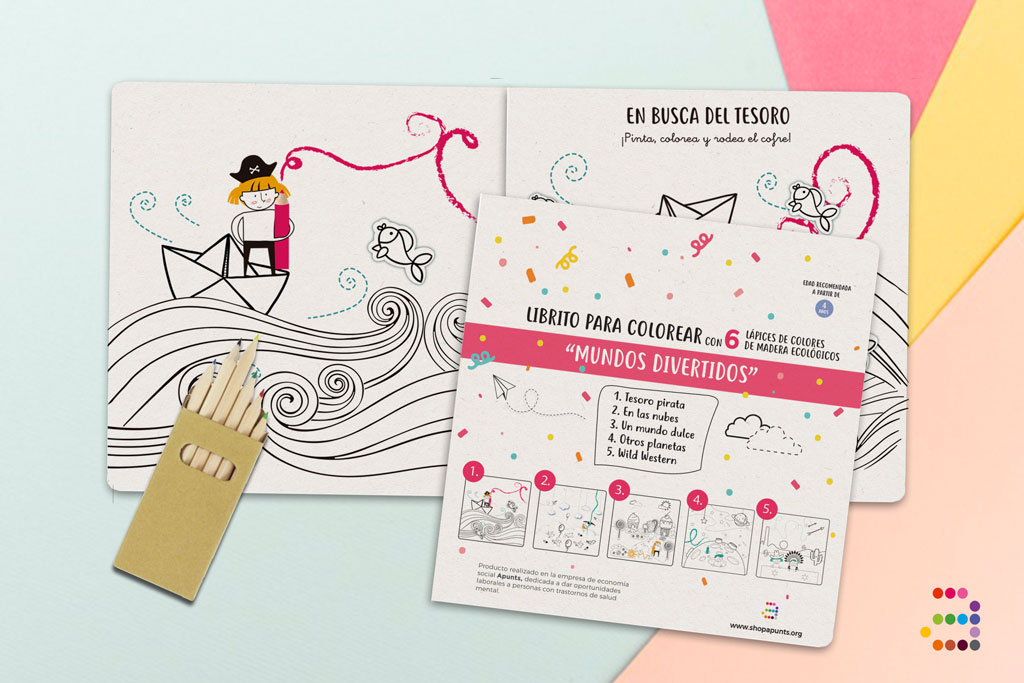 El librito tiene un tamaño de 200x200mm. Va grapado e incluye 6 lápices de madera ecológicos ¡para que puedan estrenar enseguida las actividades!