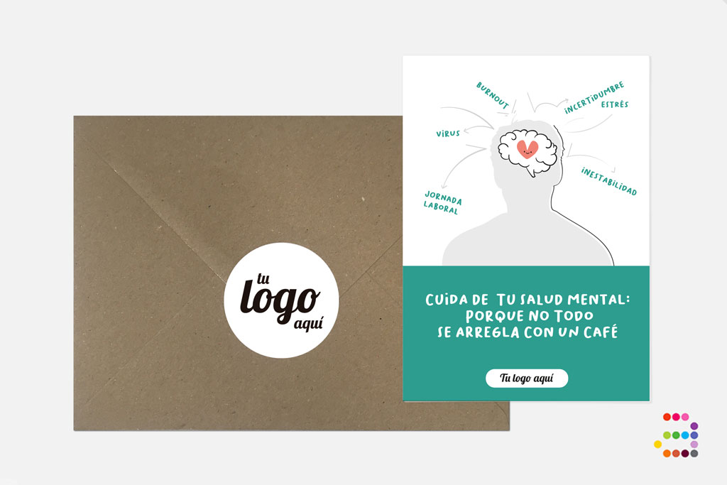 En el Día Mundial de la Salud Mental os proponemos concienciar los equipos de trabajo con esta postal personalizada con el logo de tu empresa u organización, en la que se dan varios consejos para cuidar de nuestra salud mental.