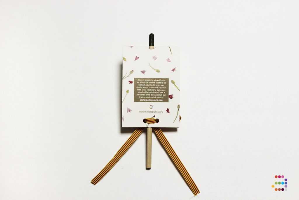 La rosa piruleta está hecha con dos materiales con segunda vida: primero de todo, el lápiz plantable con semillas de Nomeolvides, que sirve de tallo de la flor, y por otro lado, la rosa, que está hecha de papel de semillas plantable.