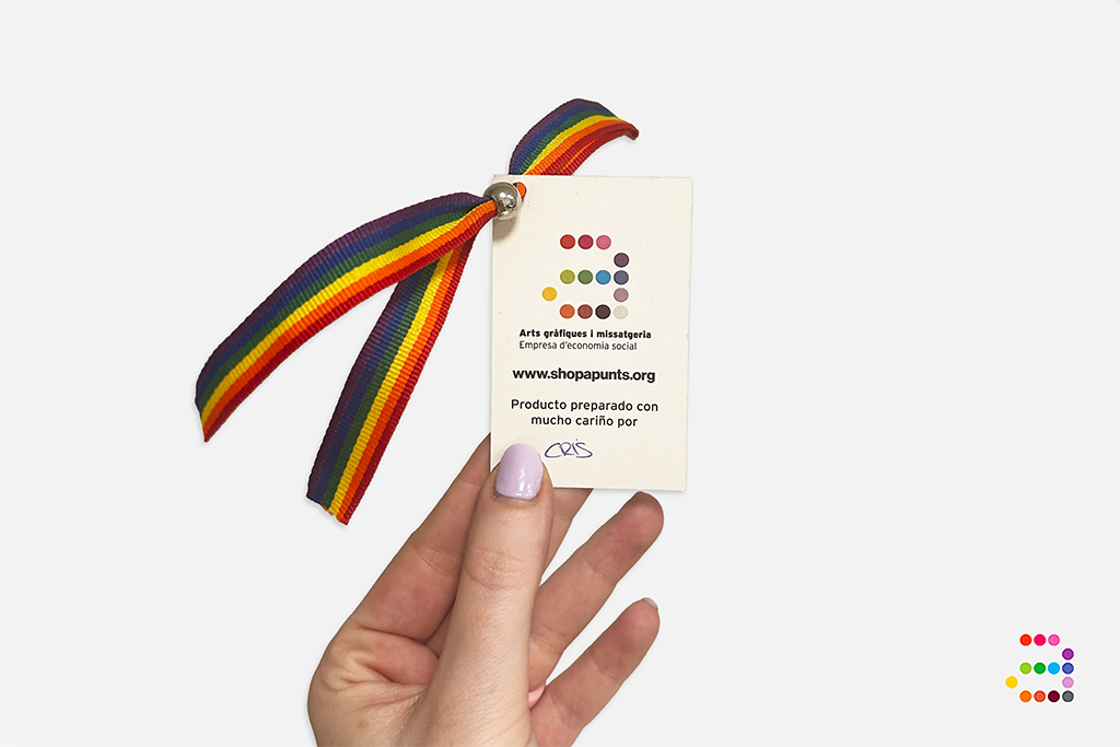 Ofrecemos esta pulsera con los colores de la bandera LGBTIQ+, de 1,5 cm de ancho y con bolita de color plata ajustable de doble sentido para ponerla y quitarla cómodamente.