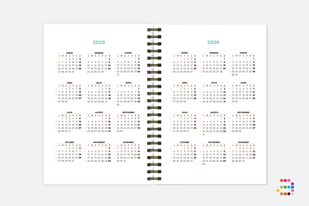 Encontrarás también un calendario del año en curso + el año siguiente, un planificador mensual a primeros de cada mes, así como días festivos o celebraciones. Además las tapas de esta agenda son bolsillo para poder guardar papeles o documentación.