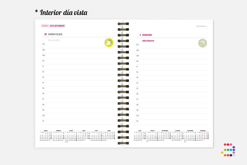 Si te gusta tener los días planificados al detalle, y además necesitas tener siempre la información a mano, la agenda día vista será tu mejor aliada, donde tienes un montón de espacio para anotar tus tareas, todas tus reuniones, citas, reservas o eventos.