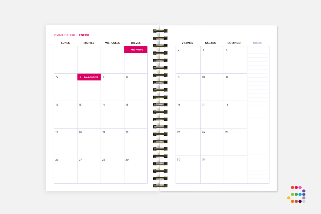 Encontrarás también un calendario del año en curso + el año siguiente, un planificador mensual a primeros de cada mes, así como días festivos y celebraciones.